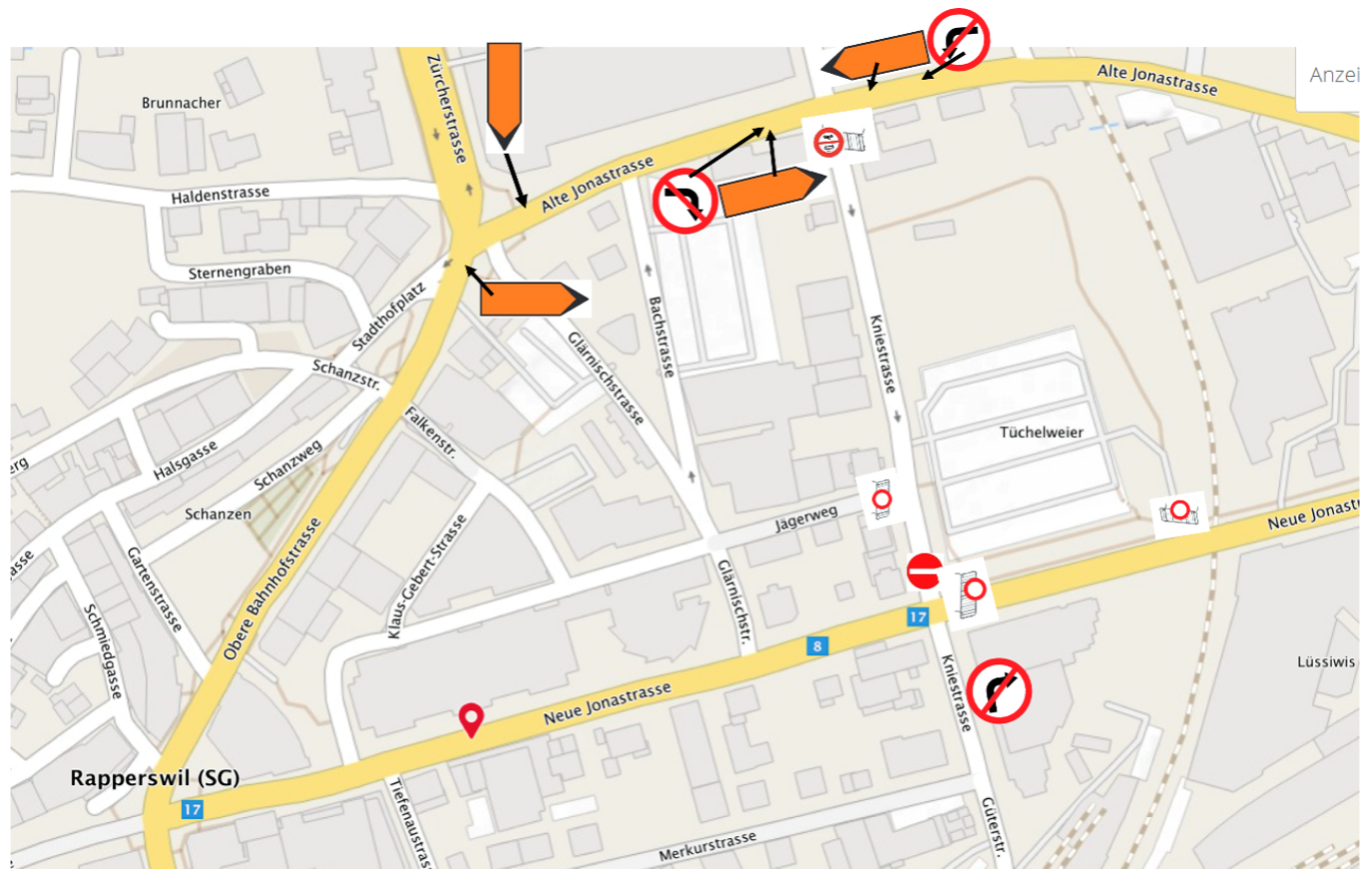 Wir möchten Sie darauf hinweisen, dass die Strassenabschnitte während der Sperrung für sämtlichen motorisierten Verkehr gesperrt sind und keine Durchfahrtsberechtigungen gegeben werden können. Den Anweisungen der Verkehrskadetten ist Folge zu leisten. Die Umleitung erfolgt über die Alte Jonastrasse.